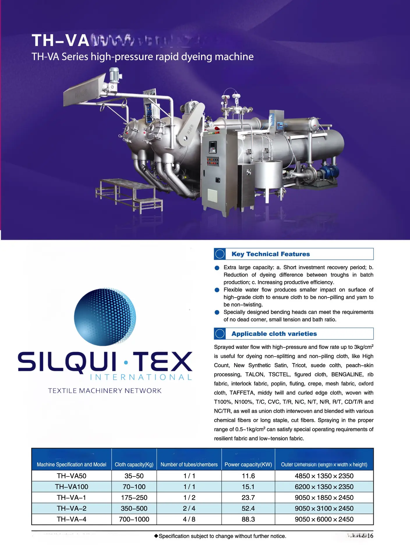 ¿Caudal de agua pulverizada con alta presión y caudal de hasta 3 kg/cm? es útil para teñir telas que no se partan ni se formen, como High Count, New Synthetic Satin, Tricot, gamuza, procesamiento de piel de melocotón, TALON, TSCTEL, telas rizadas, BENGALINE, telas acanaladas, telas entrelazadas, popelina, acanaladas, crepé, tela de malla, tela Oxford, TAFETA, sarga media y tela con bordes rizados, tejida con T100%, N100%, T/C, CVC, T/R, N/C, N/T, N/R, R/T , CD/T/R y NC/TR, así como telas de unión entretejidas y mezcladas con diversas fibras químicas o fibras cortadas de fibra larga. ¿Pulverizar en el rango adecuado de 0,5~1 kg/cm? Puede satisfacer requisitos operativos especiales de tejidos resistentes y tejidos de baja tensión.